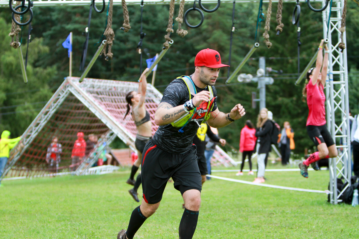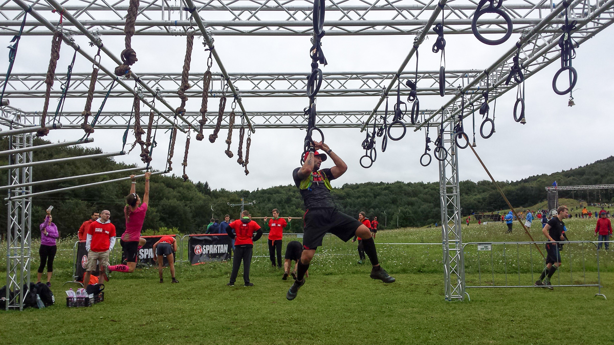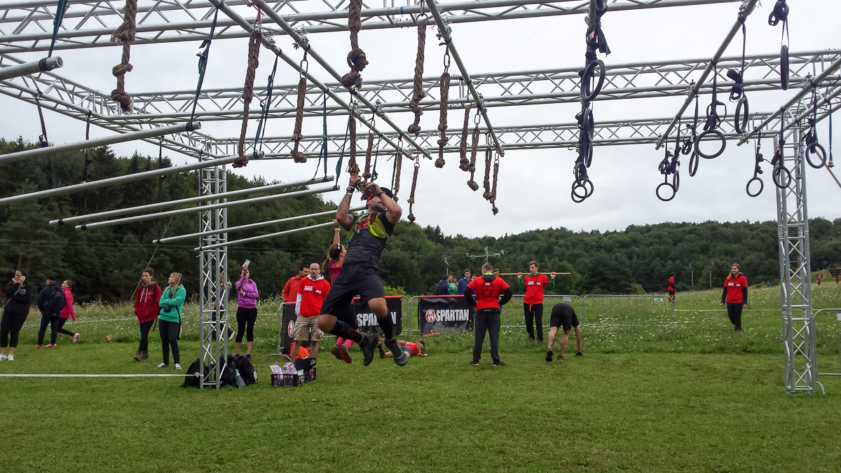 Všetci sa potkýnali a zakopávali, a ako na ne skákali aj, tak odlietavali. Potom kúsok rovinka a brodenie sa v rieke a zas kopec. Na ten sme šli dlho a pomaly a popri rom bolo pár prekážok .. bucket gift (veľké vedro so štrkom bolo asi 2x ťažšie, lebo pršalo (videl som ako mi tam voda pláva). Bežalo sa mi fakt super na moje počudovanie (viď. úvod) .. spolu s Erikom sme si to vyšľapali hore (som rád že som sa ťa držal kámo :) ). Keď sme konečne začali zbiehať dolu čakalo nás 30 burpees (nedali sme oštep), potom znova bežecká časť a prekážky .. až kým sme nedošli k balansu .. bežal som v nových botách takže som ich nemal odskúšané na balansových prekážkach, teda som snimi nebol zžitý doslova :D takže tam sa mi Erik stratil a ja som si dal znova 30 burpees (spolu 60). Po rozbehnutí som cítil akosi značnú stratu energie a nohy začali akosi protestovať .. ale rozbehol som to!!! Bohužiaľ ale hneď ďalšia prekážka boli kolíky ďalších 30 burpees (spolu už 90) voluunteri ma ale povzbudzovali, tak som ich dal svižnejšie. Strata energie a sily už bola dosť citeľná, už mi to tak nešľapalo do kopca a spomalil som. Nasledovali vrecia s pieskom (tiež premoknuté a ťažšie boli) išiel sa celkom kus dolu a hore kopcom.