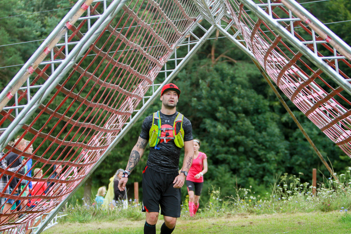Potom som to zas rozbehol .. dobehli sme ku "A" cargo sieti pri cieli ale prebehli sme iba popod ňou a šli na multiring .. ten som zvládol bez problémov. Od neho sme zas iba stúpali do posledného kopca ktorý ma totálne odrovnal. Na začiatku kopca bolo plazenie sa pod ostnatým drôtom .. tu som sa strašne nasral . nabudúce nech ho daju rovno na zem! Však bol iba kúsok nad zemou .. malí ľudia mali problémy .. čo potom ja skoro 2metrový, 92kilový človek čo cvičím .. s nervami a dierami v kraťasoch, camelbaku a tričku som to dal. Stúpanie pokračovalo donekonečna .. asi v jednej tretine kopca som dostal neskutočné kŕče do slabín až som zastavil a nevedel som či mám plakať či čo (pritom v 7km a v cca 11km som si dal magnézium) .. chvíľku som to predýchaval a pohol som sa znova hore no každých pár metrov som si musel hamstringy a slabiny naťahovať .. zvyšné dve tretiny kopca som už nejak vyšľapal s bolesťami .. hore bol monkey bar "A" ktorý som vpohode dal (ruky ma neboleli), potom sa už iba zbiehalo ale to som tiež pomaly šiel lebo slabiny ma nepustili bežať dolu. Až kusok za polovicou zbiehania bol memory recall (celkom super kód som mal ZMTQY848 - Zuzana, Marta, Tomino, 2 pripečené písmena abecedy a 848 bola lahoda) tak som ho bez problémov povedal .. tu mi konečne slabiny dovolili sa rozbehnúť tak som to napálil dolu kopcom, lebo už som videl posledných 5 prekážok a cieľ!!! Hlava nehlava som skákal z vody do vody, liezol na lano, a preletel som "A" cargo sieť a dobehol som do cieľa.