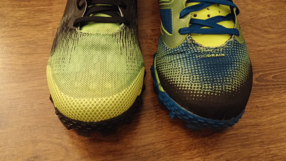 Takže pojďme se jim podívat na zoubek. Je něco po osmé ranní a já nazouvám nové Super dvojky. Za necelou hodinu se v nich postavím na start závodu Spartan Race Beast v Koutech. Než ale společně s dalšími závodníky vyběhnu na 24km dlouhou trať, uděláme si malé srovnání s prvním modelem. Už na první pohled je patrné, že došlo k několika zásadním změnám. Špička dostala novou ochranu a původní lehké pogumování bylo nahrazeno pevnějším celogumovým osazením, které by mělo více chránit prsty před nechtěným nakopnutím kamenů, větví, kořenů nebo jiných nástrah, které na vás během závodu číhají. Svršek je opět z kvalitního nesákavého materiálu, oproti jedničkám více perforovaného a z boků až do paty ještě přibylo „pogumováni“ průhlednou vrstvou, která botu zase o něco více zpevní a hlavně zabrání vnějšímu poškození. Příjemnou změnou prošlo určitě šněrování a jazyk. Sice zmizela zadní dírka, ale na botě teď uděláte o křížek víc, což spolu s delším, širším a hlavně silnějším jazykem nohu v botě pohodlněji a přesněji usadí. Už byste neměli s každým pokrčením boty nabírat nečistoty, ani mít ten nepříjemný pocit, že při broděním bahnem vylezete na břeh bosí. I místo kolem dírek tkaniček bylo výrazně zesíleno. Tkaničky ale zůstaly stejně jako u předchozího modelu slabé jak struny. Díky těmto drobným změnám boty přibralynecelých 20 g a velikost 43 (280mm) na váze ukázala 263 g. Podrážka zůstává zcela beze změn. Drop 5 mm, hrubý vzorek z měkké gumy (ale né tak měkké jako např. u konkurenčních xtalon 212) takže vám nebude doslova mizet před očima, když vás pořadatel závodu vyžene na několikakilometrový přesun po asfaltu. Nejsilnější stránkou opět zůstává drenáž v podrážce, nebo chcete-li odvodňovací kanály. Díky nim vám nebude dělat problém ani brodění potokem, nebo skok do vodního příkopu. Voda prodyšným svrškem okamžitě odtéká, takže vám nohy s každým krokem netěžknou a jen co vylezete zpátky na břeh, stačí uběhnout pár desítek metrů a vodu díky drenáži bez problémů vyšlapete. Za pár minut si ani nevzpomenete, že jste se vlastně před chvílí koupali.