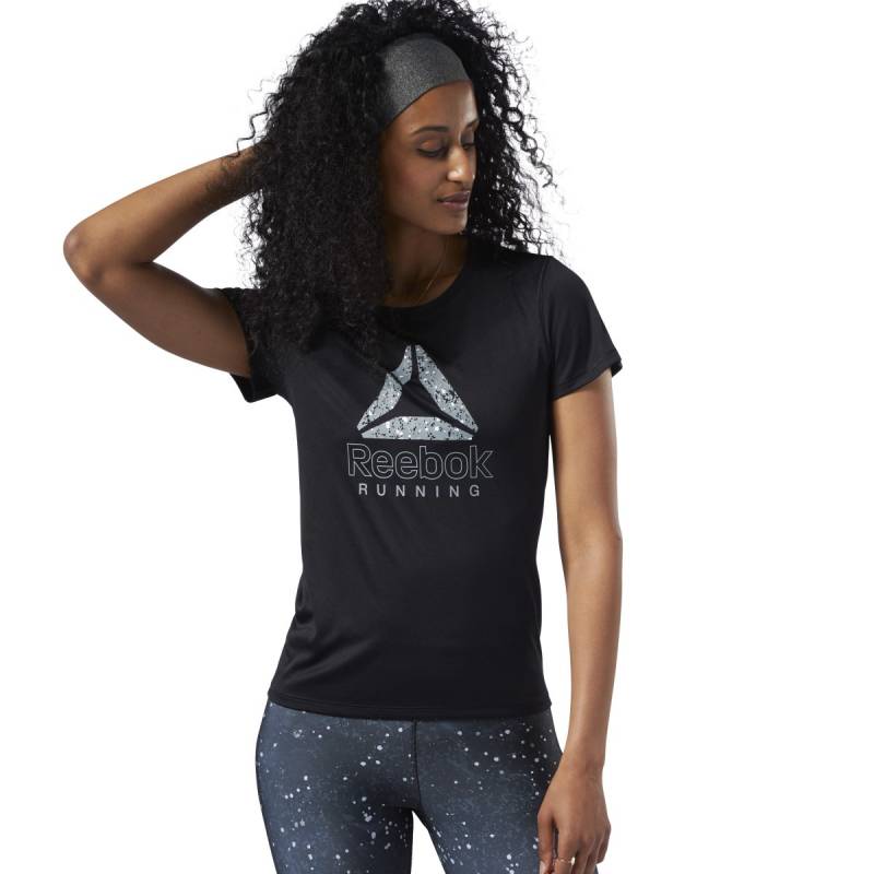 Bring intensity to your running without overheating in this womens running tee. This slim fit tee features moisture-wicking fabric to help you stay dry. Mesh panels offer ventilation and breathability. The tee has Reebok running graphics across the front.