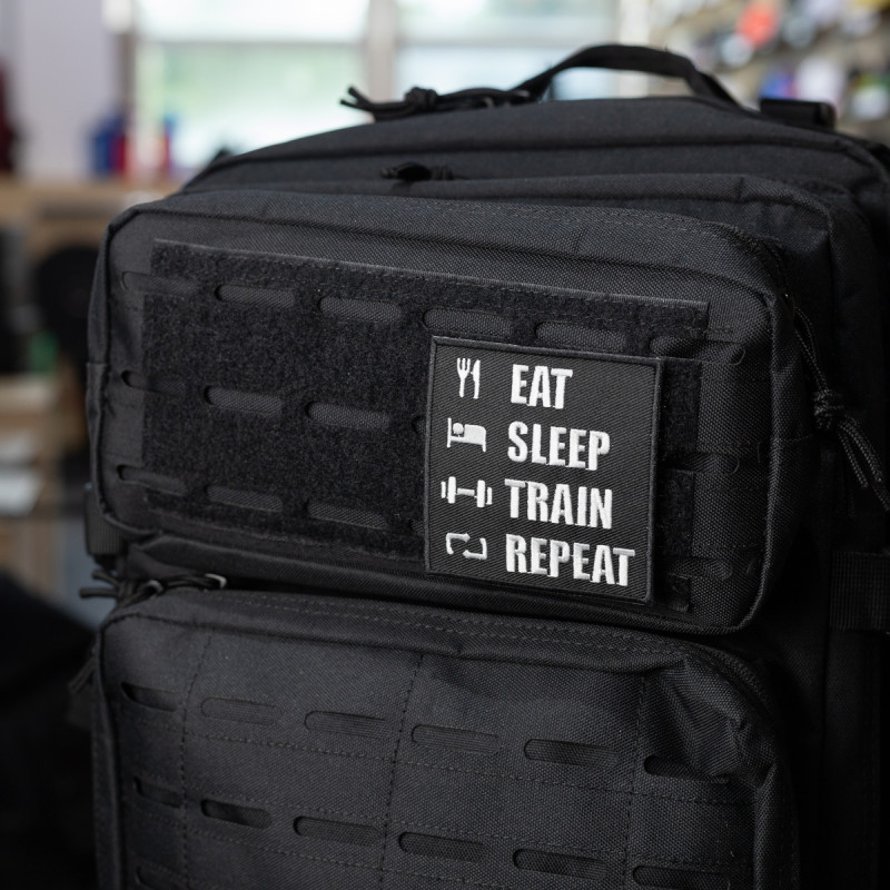 Nášivka s textem "Eat Sleep Train Repeat" pro sportovce se suchým zipem na zadní straně.